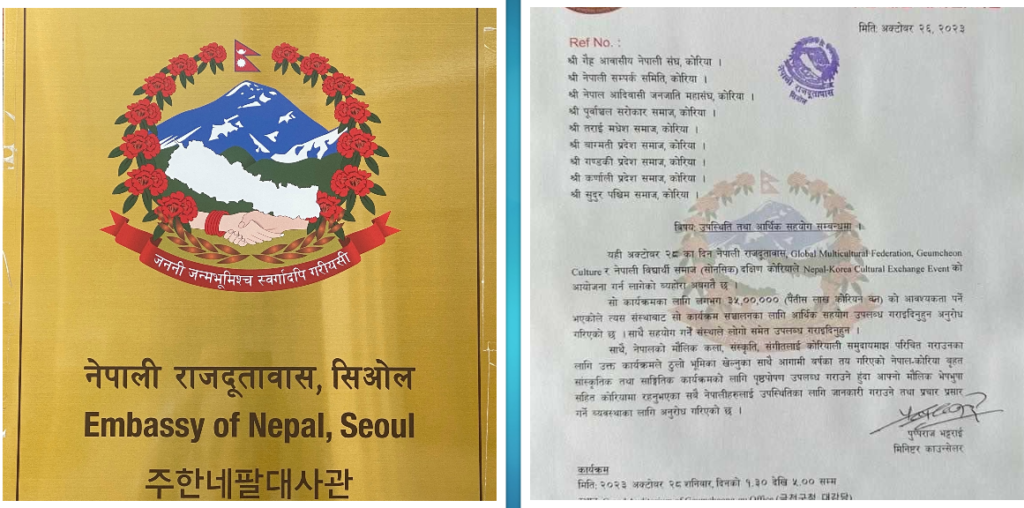 काठमाडौं : दक्षिण कोरियास्थित नेपाली दूतावासले सांस्कृतिक कार्यक्रमका लागि त्यहाँ रहेका नेपाली समुदायसँग आर्थिक सहयोग मागेको छ। आज दक्षिण कोरियाको राजधानी सिओलमा हुने ‘नेपाल–कोरिया कल्चरल इभेन्ट’ का लागि निम्तासहित दूतावासले त्यहाँ रहेका ९ वटा नेपाली समुदायका संगठनसँग सहयोग रकम मागेको हो ।